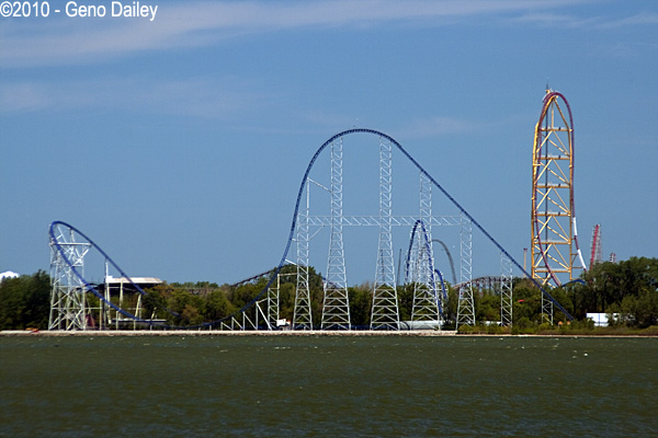 | A view of Millennium Force as seen from Battery Park across Sandusky Bay in downtown Sandusky, OH. |