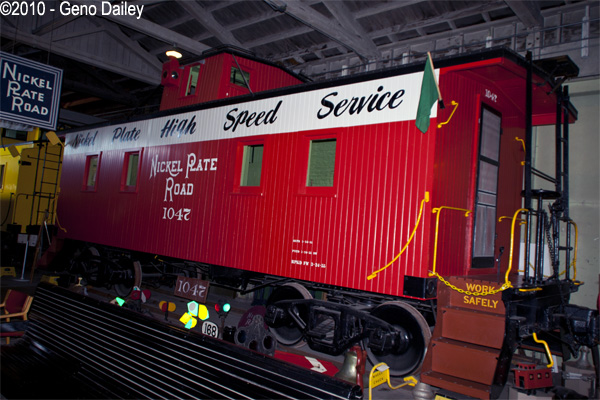 Nickel Plate #1047, a wooden caboose on display inside one of the museum's buildings.