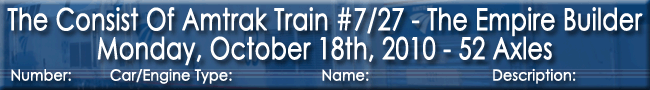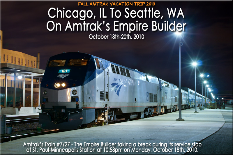 Once arriving at St. Paul-Minneapolis Station (arrived 16 minutes late at 10:47pm), my plan was to do a night photo of the train. I decided that since I would need to use a tripod and this was a busy station, that it would be a good idea to contact Amtrak Media Relations before taking this photo just to make sure there would be no problems. I was given a verbal approval to take this photo from them as I was a ticketed passenger. I advised them that I would only be using a tripod and cable release on a consumer grade Digital SLR camera, no umbrellas or extra lighting was necessary. Once the train arrived, I grabbed the camera & tripod and ventured out to the platform to get set up to take the night photo. I wore my valid press credentials from TrainWeb's Rail News Division and would initially be told by one Amtrak employee they didn't want photography there because if one person goes to take a picture, more will follow! After showing my press credentials, as well as explaining that I had spoken to Media Relations about this, as well as some additional pleading with this person, he finally let me take the picture! You've already seen it, its at the top of this page! By the way, for the record, nobody followed me up to the head end to take a picture either! While there, I also got photos of the Puget Sound and Gritty Palace private cars that were parked at the station, you'll see them a bit later. There are several private cars parked at the station. Had there been more time, I would have gotten photos of all of them as they were absolutely beautiful cars! Night Photography is a very time consuming thing however, so shortly after getting the photo of the Puget Sound car, I reboarded the train and we left Minneapolis 1 minute late at 11:16pm. I put away the camera and had my bed turned down for the night. I then took a shower and called it a day, and what a day it was!!!