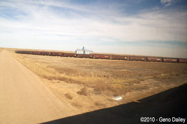 | A string of covered hoppers near a grain elevator somewhere in northeastern Montana. |