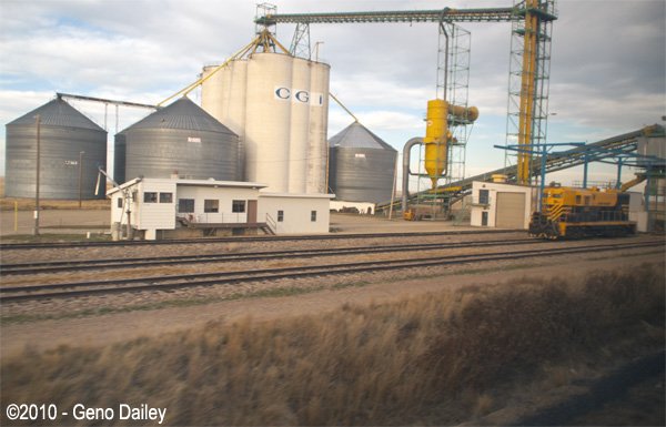 The Columbia Grain International facility near Rudyard, MT. The locomotive is a GP-9 that is owned