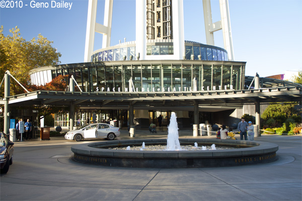 | The main entrance to the Space Needle in the middle of the grounds that make up the Seattle Center. |