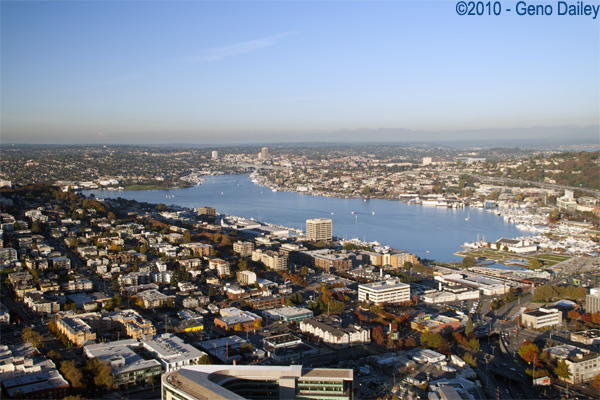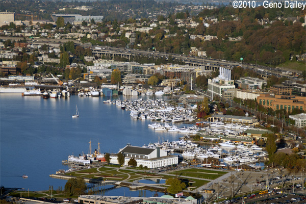 | Closer view of Lake Union with the South Lake Union Park in the foreground. |