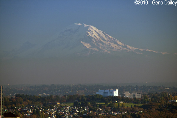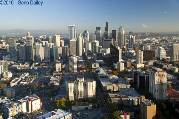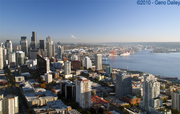 | The Seattle Skyline against Elliott Bay with Mount Rainier in the background. |