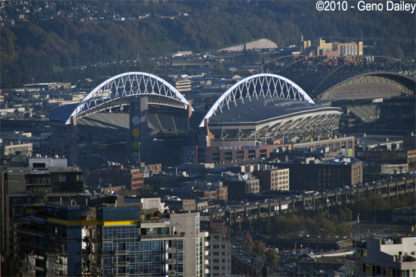| Qwest Field, home of the NFL's Seattle Seahawks. Behind it is Safeco Field, home of Baseball's Seattle Mariners. |