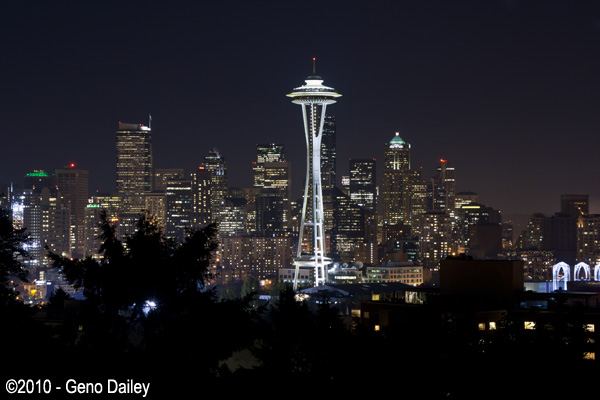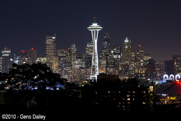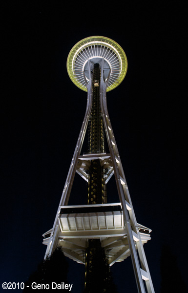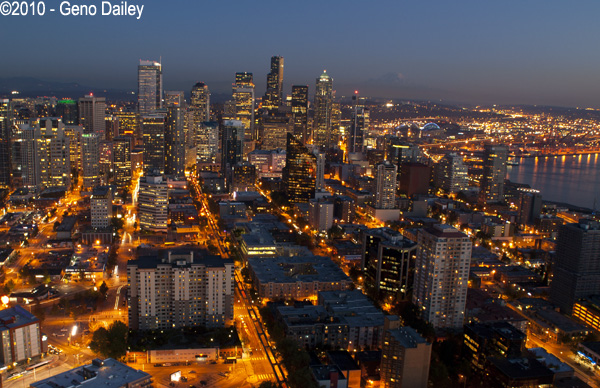 There are compass headings on the floor of the observation deck, so I started at the North heading and took pictures all the way around. Since I decided to visit the Space Needle later in the day, I figured I would be here for both day and night photos as well as get a decent sunset photo as well. I wanted to bring the tripod along so as to make the night photos a bit easier to take, but after a quick phone call to make sure this was allowed, I was told it was not. So I never brought the tripod. I ended up talking with a local photographer (once I was already at the Space Needle) who was also trying to get a sunset photo as well and he told me he brings his tripod all the time! Oh well, I wasn't about go leave and go back to the hotel again to grab the tripod when I was in the middle of some excellent light for "dusk" photos coming up! I had mentioned to this photographer that I wanted to get a night photo of the Seattle Skyline. Prior to this trip, I read about the Alki Beach area but he ended up telling me about Kerry Park on Queen Anne Hill which was a lot closer to the Space Needle as well as my hotel. After getting a nice sunset photo and some night photos from the top, I walked back to the hotel, got the tripod and a taxi over to Kerry Park! The taxi driver actually didn't know where it was and because of this, shut off the meter and capped my cab fare at $7.00. He did eventually get me there though and once I arrived, I was absolutely amazed by the incredible view of this city at night!!! There were several other photographers there as well trying to get the same photo as I would get. Shown here are some views of the Space Needle, the City Of Seattle as viewed from the Space Needle and views of Seattle from Kerry Park. I had a great time here and hope you enjoy the photos!!! |