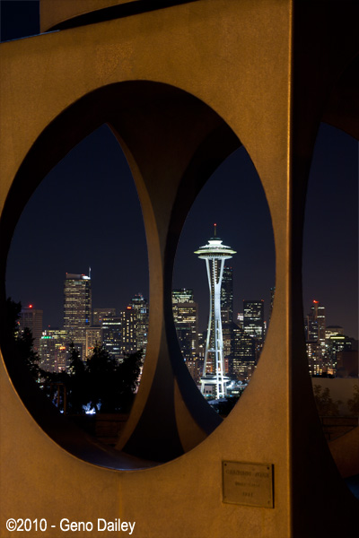 LEFT: The sculpture "Changing Form" with the Space Needle hiding behind!