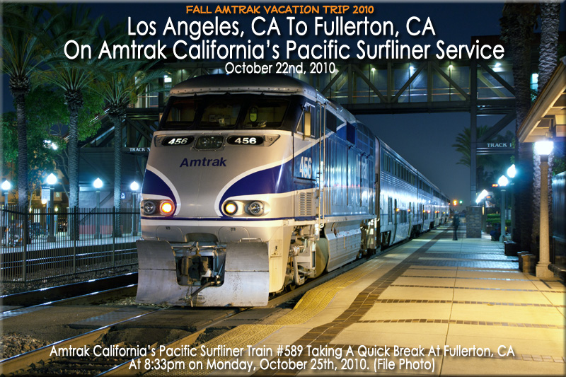 | We were set to depart Los Angeles on time at 10:10pm. We would only move a few feet and the train would stop again. There may have been a problem with the brakes not releasing on the rear unit but I wasn't able to confirm that. We eventually exit Los Angeles and would ride past the 8th Street Yard and shops along with the Redondo roundhouse and continued on past Hobart Yard on the BNSF. Things would be uneventful until we got to just a few miles outside Fullerton. We had to stop initially for another Surfliner train to pass us. The train eventually passes us but then, we didn't move! An announcement was eventually made that there was a "mechanical problem" and we would sit there for about 15 minutes while it's being taken care of. It took over 20 minutes and I then saw the crew walking alongside the train outside with a flashlight, then standing still and doing some kind of roll-by inspection. We were finally on our way and would end up arriving in Fullerton at 11:26pm, running some 46 minutes late! The conductor apologized for the delay and stated they were gonna try to make up time on the way to San Diego. I got off the train in Fullerton which would be the end of my Amtrak travels on this trip, and strangely, that was the only mechanical delay I experienced on this entire trip!!! I took the elevators over to the other side of the tracks so as to access the parking lot where my Aunt and Uncle were waiting for me. I would spend the first night at their house then be picking up a rental car from Enterprise Rent-A-Car on Saturday to go do some Southern California Railfanning! Once arriving at my Aunt and Uncle's house, I would do laundry and eventually call it a day! And so ends my Amtrak traveling but this vacation is by no means over yet. It's time to take a drive and do some great railfanning along the beautiful Pacific Ocean, stay tuned!!! |