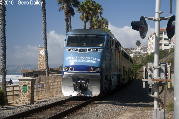 At Avenida Victoria, F59PHI #457, decorated up for the 10th Anniversary of the Pacific Surfliner