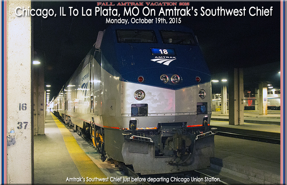 I would take a few more photos on the platform before going back to my room and at 3:00pm, Train #3 departed Chicago Union Station on time and would head south out of the station, then turn west on to a BNSF mainline. The sleeping car attendant in my car introduced himself to everyone in the car and let us know where the bathrooms were in the car and other services he provides. He was very professional and did his job very well. An announcement was made letting us know that dinner in the diner was by reservation only and a member of the staff would be walking through the train to take down reservations. The conductor came by and scanned my phone which had my ticket displayed in the "Apple Wallet" app (formerly called the "Passbook" app). We had to sit outside the Naperville, IL station for about 5 minutes to let a Metra commuter train clear the station. I would take a reservation for 6:00pm for dinner since I was getting off the train in La Plata, MO. There must have been 6 seatings announced for dinner, with the last one being after 8:00pm! When I boarded this train in 2012 at La Plata to head for Los Angeles, I was served dinner just after departing there so that late of a seating available would make sense. We made our first stop of Naperville, IL at 3:39pm and quickly departed at 3:41pm, running 6 minutes late.