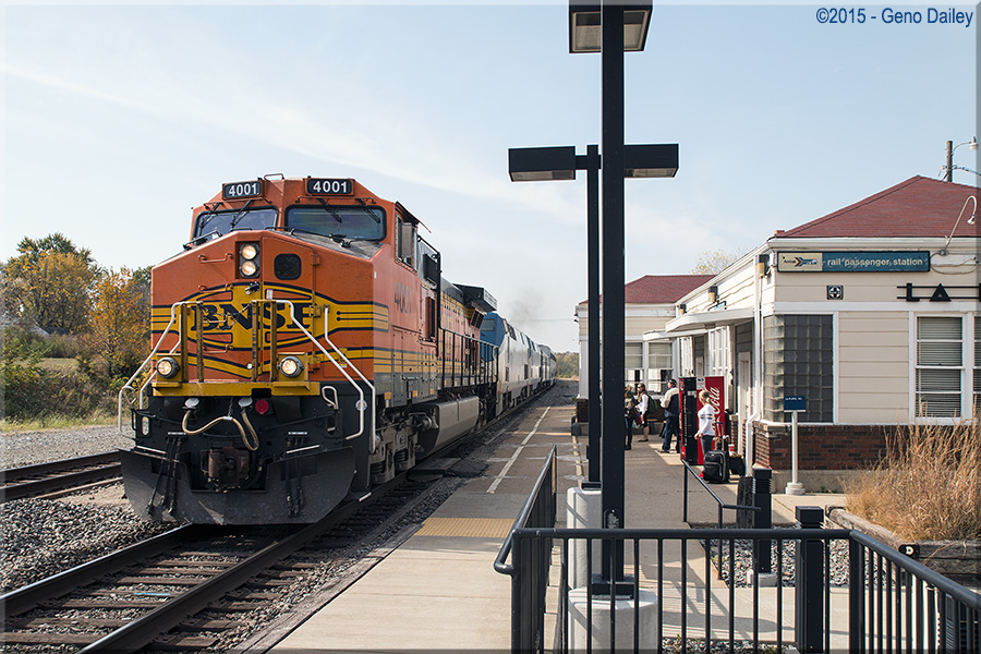 Arriving in La Plata, MO is Amtrak Train #4 - The Southwest Chief with BNSF GE C44-9W #4001 as the leader. No, BNSF is not running long-distance