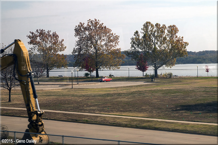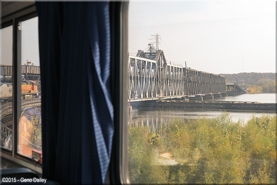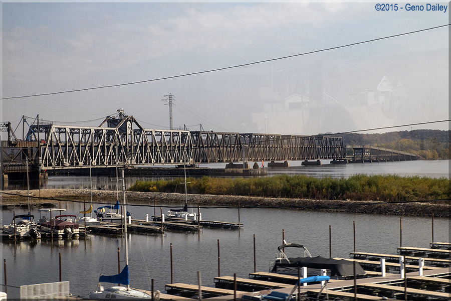 Looking out the window of the Dining Car, we are making the sharp turn onto the Fort Madison Toll Bridge. The bridge itself is a double-deck swing span. |