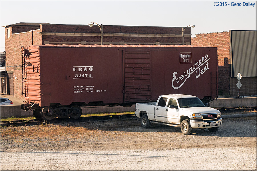 Chicago, Burlington & Quincy 40ft Box Car #32474 on static display near the Galesburg station. This photo captures a little bit of a "time warp"!