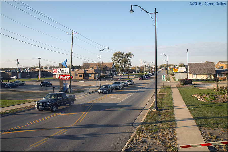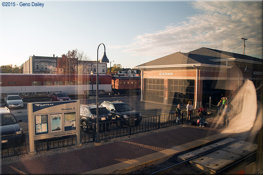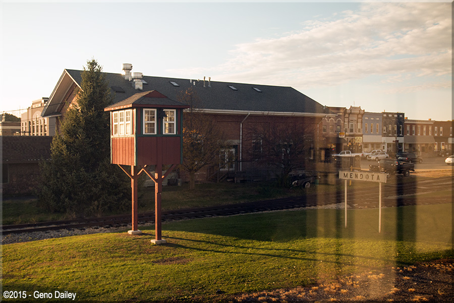 Now arriving at our next station stop of Mendota, IL, very close to sunset due to our lateness today. The Mendota station sits on the grounds of the