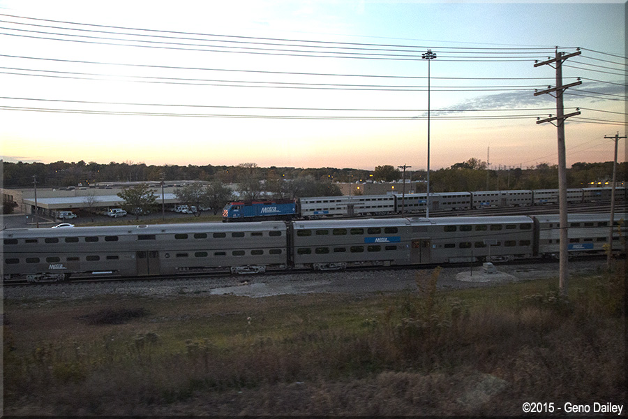 Passing by Metra commuter trains in their yard in Aurora which marks the end of the line for their service on the BNSF route out of Chicago. |