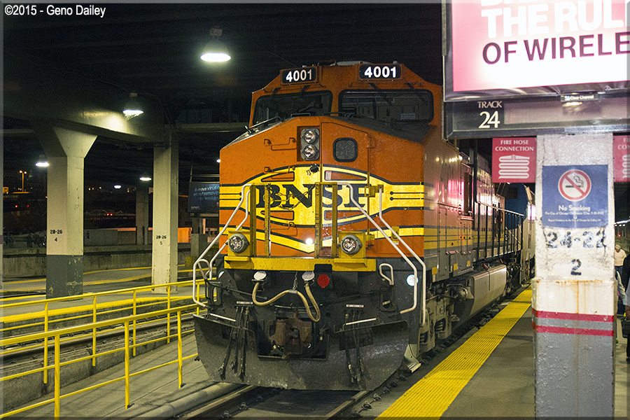 Having now arrived at this train's final station stop of Chicago's Union Station, BNSF GE C44-9W #4001, our train's leader, sits on Track #24. Let's