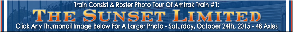 | Around 8:00am, I arrived at New Orleans Union Station, having taken a taxi there from the hotel. I checked in with one of the ticket agents who gave me a 4-digit coded to access the Magnolia Room. The Magnolia Room is a lounge for Sleeping Car passengers only. Well, the lounge had a good size crowd in it and featured lots of lounge chairs and coffee as well as danishes and cinnamon rolls though only one was left when I arrived there (and of course I didn't wanna be the guy who grabbed the last one, wouldn't want all the unnecessary "dirty looks"!). Overall, it was nice having a private lounge but it could use a few more amenities to make it more of a true "First Class Lounge". I would chat with a few passengers including a couple from Oregon who were travelling all over the country on what was likely a USA Rail Pass (Amtrak offers these for cross-country travel that are valid for a certain number of days as well as number of trains). I also chatted with a former engineer who used to work for Conrail, SEPTA (Southeastern Pennsylvania Transportation Authority), and Amtrak. I knew there wouldn't be breakfast served on this train so I picked up three candy bars in the gift shop at the station (gotta wake up somehow!). I eventually would get in line as our boarding of the train started around 8:30am. ID's were checked along wit the scanning of tickets by the conductor as we headed outside to the platform. I noticed we would have a private car on the train today as well! I would get the consist of the this train as I walked the platform. The consist for today's train is shown below: |