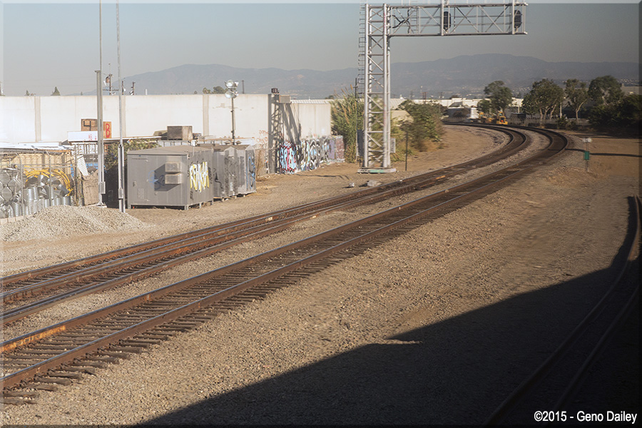 The BNSF San Bernardino Sub which this mainline, the former Santa Fe "Surf Line", now owned by Metrolink, merges with just past the Fullerton, CA station.