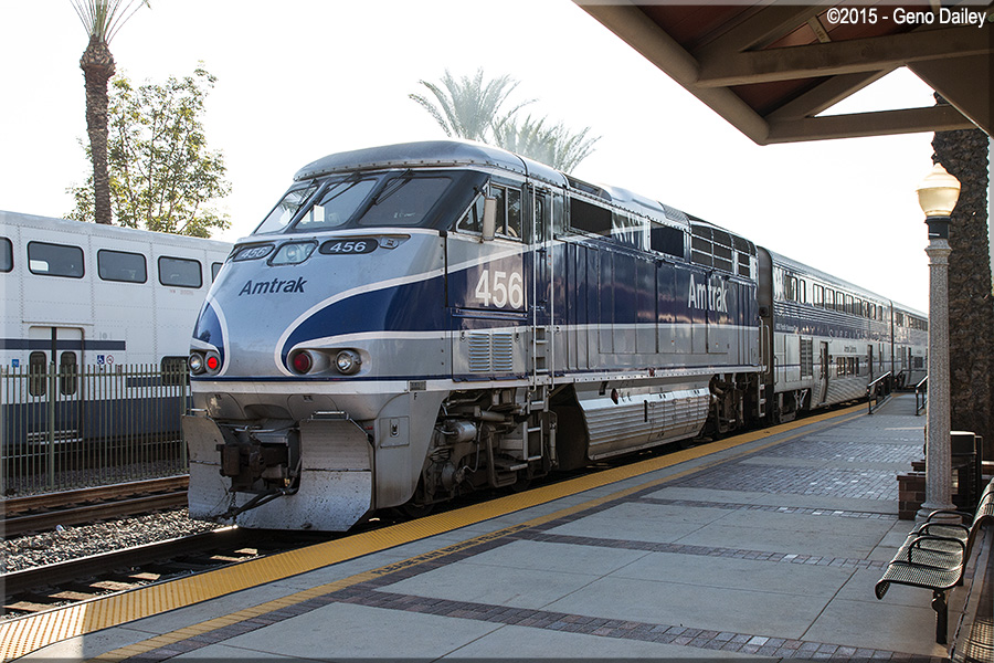 Amtrak California Train #579 having just departed Fullerton, CA, with EMD F59PHI #456 "pushing" the train north to Los Angeles. |