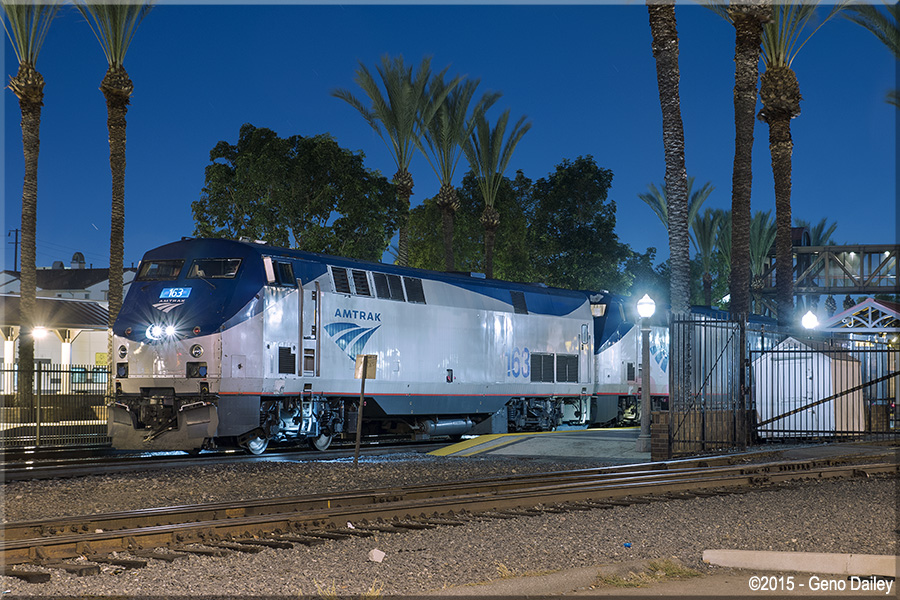 Amtrak Train #4 - The Southwest Chief taking a break at Fullerton, CA with P42DC #163 leading. I took this photo after dinner at the