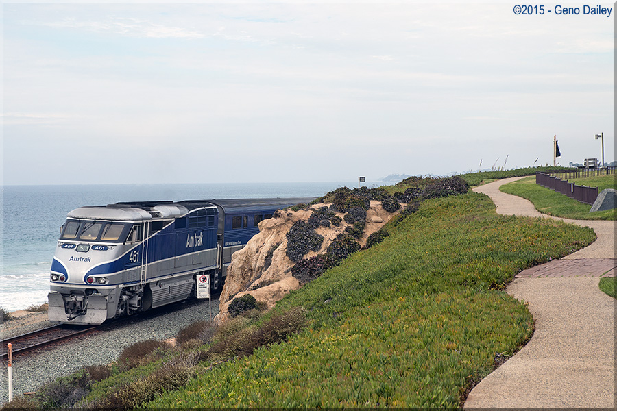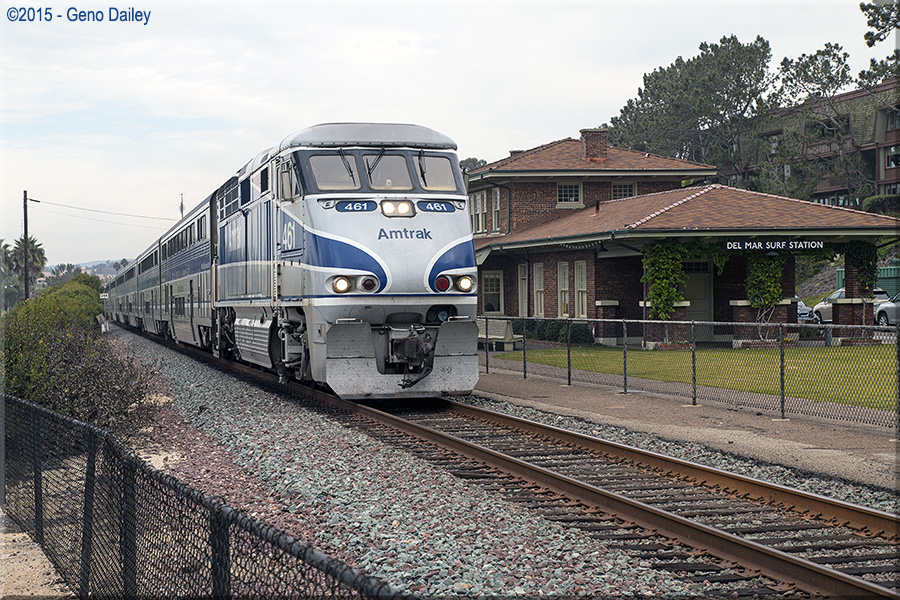 Train #566 passes by the Del Mar Surf Station with F59PHI #461 leading this San Diego-bound train. |