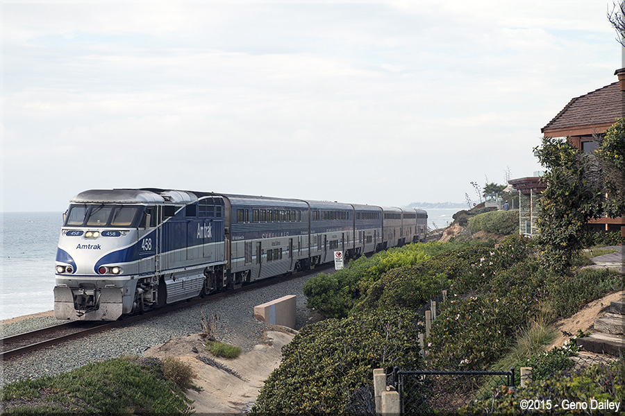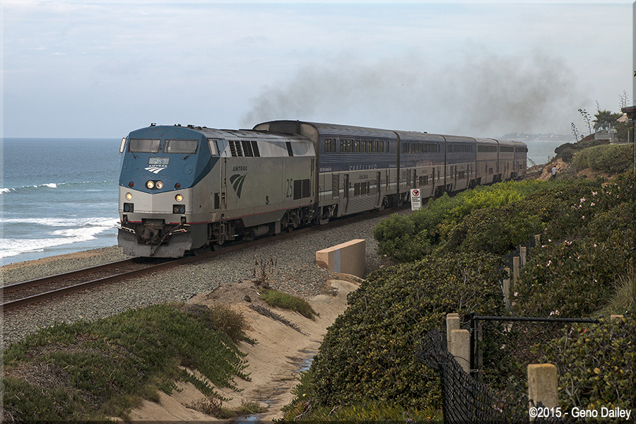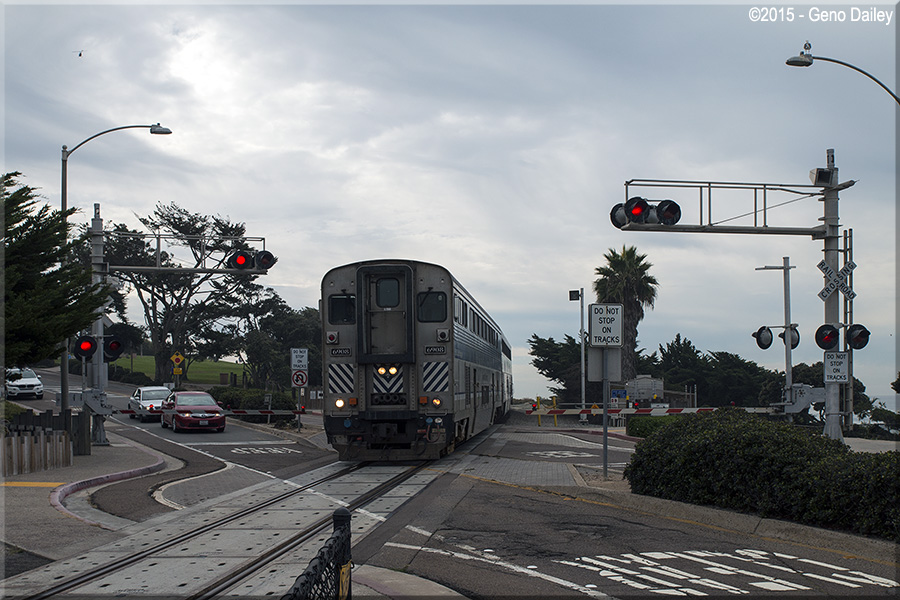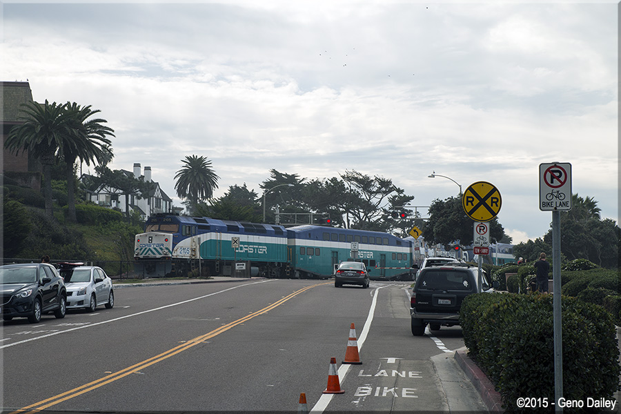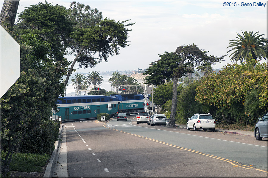Train #573 crosses Coast Blvd. in Del Mar. This is actually a "quiet crossing" for these trains. Rather than the train activate its horn at the crossing,