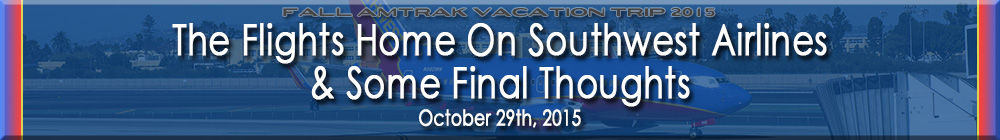 Today would be the day it was time to come home. This has been an absolutely incredible journey across our beautiful country, and looking back, I truly had a great time! I started the day going over some financial-related stuff and writing this travelogue as I finished backing up all the photos taken last night. I checked out of the hotel and drove to a nearby Shell gas station to put gas in the rental car, then over to McDonald's for a quick breakfast before driving to Enterprise's San Diego Airport site which is located outside of the actual airport (similar to Las Vegas and Los Angeles). After turning in the rental car, I took their free shuttle bus to the Southwest Airlines terminal at the San Diego International Airport, checked my bags, went through security, then found my gate as I would board Southwest Flight #1375 to Phoenix, AZ where I would make my connecting flight which was Southwest Flight #3209 non-stop to Buffalo. I then found a place to sit and plug in my laptop and continue working on this travelogue and get a head start to color-correcting some photos as it would be another two hours before my first flight takes off. My flight to Phoenix today would be aboard a Boeing 737-500 (Southwest only flies Boeing 737 aircraft).