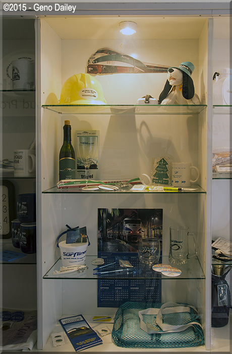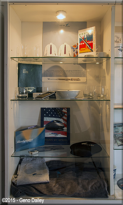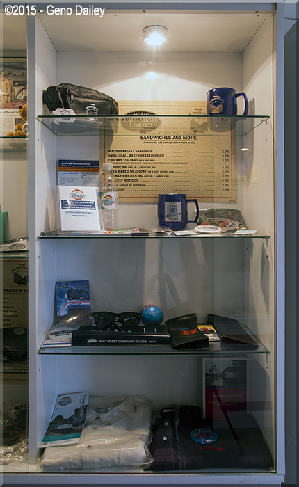 LEFT: Amtrak coffee cups, employee paperwork, and more t-shirts. RIGHT: Memorabilia dedicated to Amtrak's high-speed rail service on the
