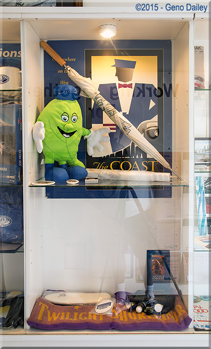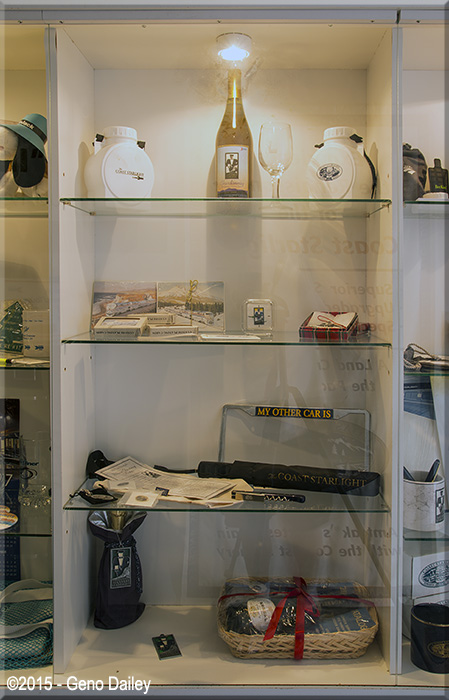 including a bottle of wine and pins and such, along with Pacific Surfliner branded merchandise, some of which celebrating its inaugural run in 2000. |