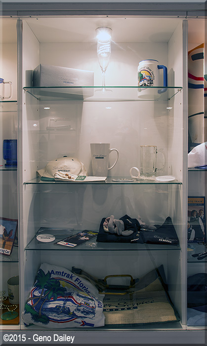 LEFT: Amtrak lanterns, a bow tie, hat, neckties, and lots and lots of pins and buttons!!! RIGHT: Amtrak coffee mugs, napkins, glassware, a model