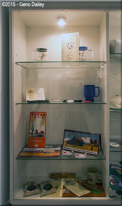 Chicago-San Antonio (with thru-cars to Los Angeles) Texas Eagle is represented with travel mugs, dining car menus through the years, and some