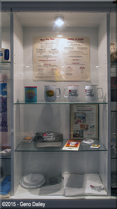 LEFT: Amtrak's Sunset Limited which runs from New Orleans to Los Angeles gets representation from a menu, coffee mugs, hat, deck of