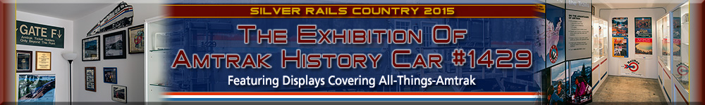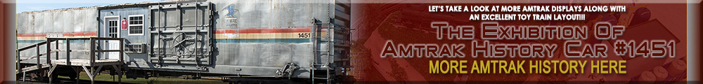 | The first of the two Material Handling Cars that make up the Exhibition Of Amtrak History consist of display cases covering just about every Amtrak route both past and present, along with books and artifacts about Amtrak. The car also features Amtrak-related posters, calendars, etc. The car also has some photos from Chris Guenzler's millionth mile traveled on Amtrak. Included on this page is a complete set of photos taken in this car which I'll refer to as the "blue car" since it has a blue label next to the door when you walk in. Enjoy your tour of all things Amtrak!!! |