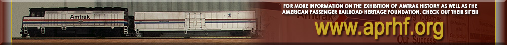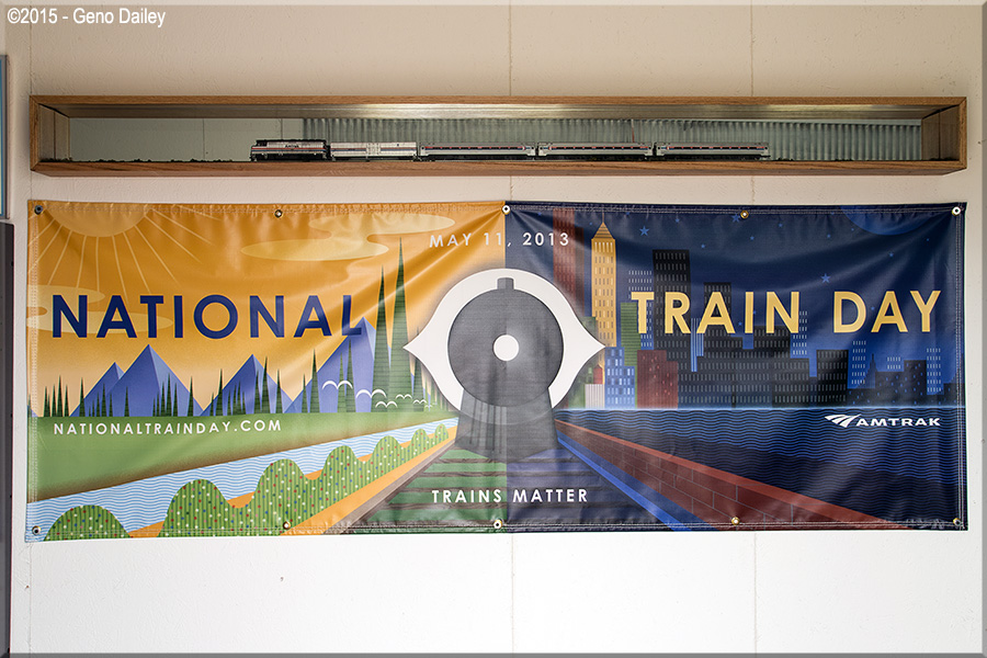 An Amtrak National Train Day banner with an HO Scale model train consisting of an F40PH, a Material Handling Car and 3 Amfleet I Coaches. |