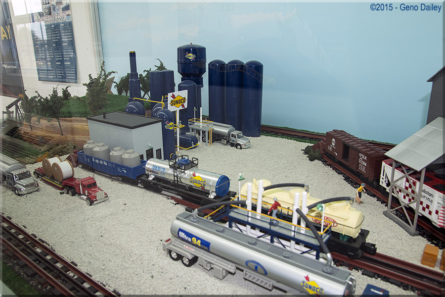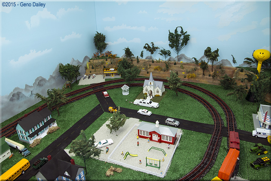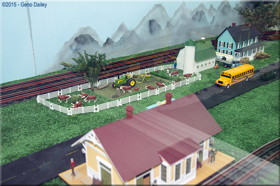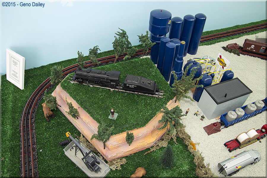 Now let's check out an excellent O Scale toy train layout. Here we have a Nickel Plate Road steamer on display with some "wild life" roaming around!