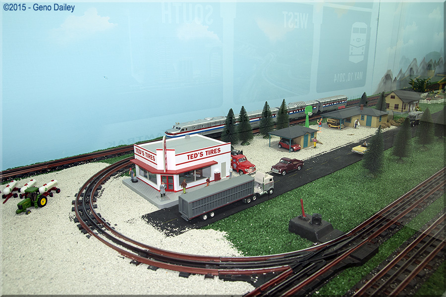 Ted's Tires sits at the end of a street with an Amtrak train hiding in the background! |