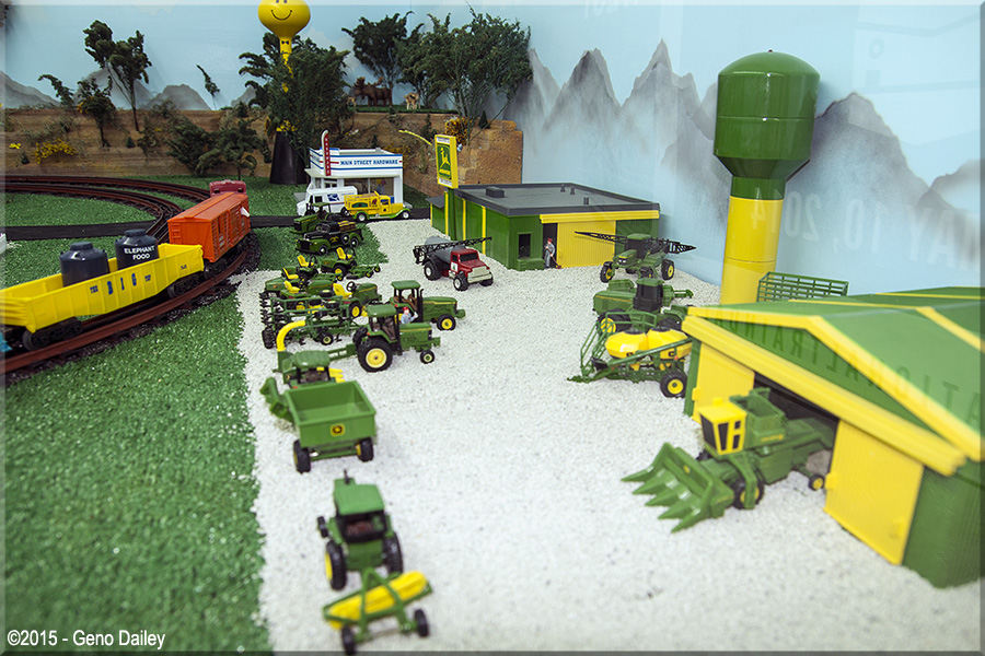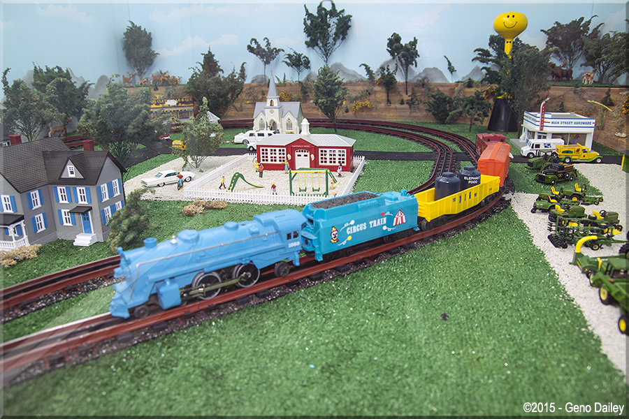 The Circus Train is in town! Passing by Plasticville School and a John Deere tractor dealership! |