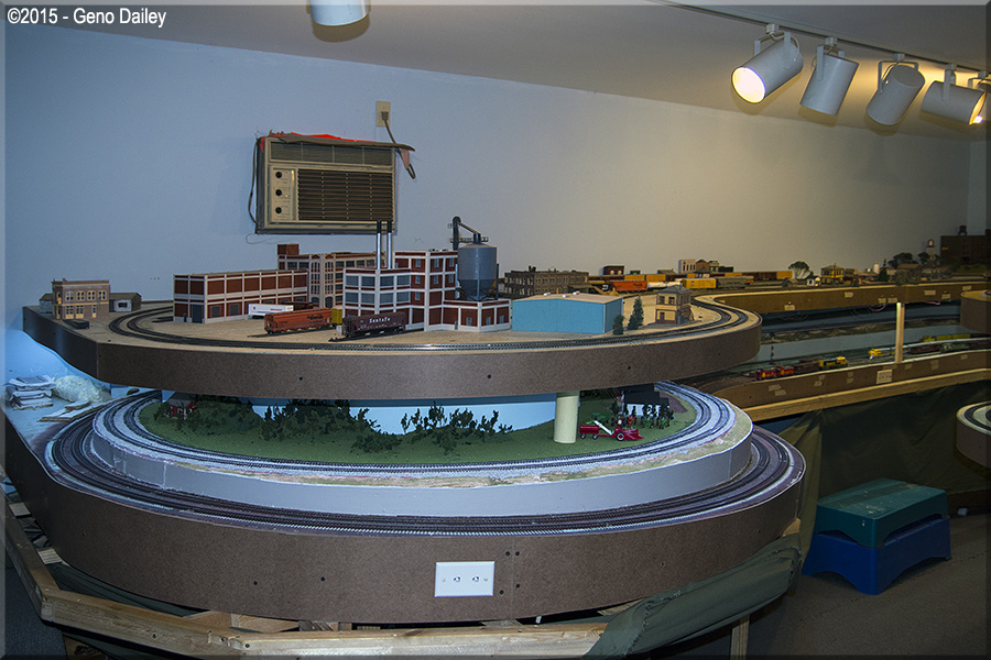 The layout has a double-track mainline and some steep grades going from one level to another. |