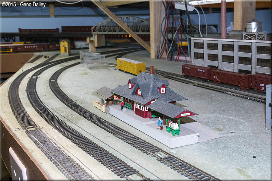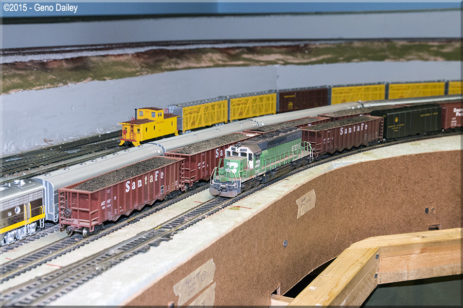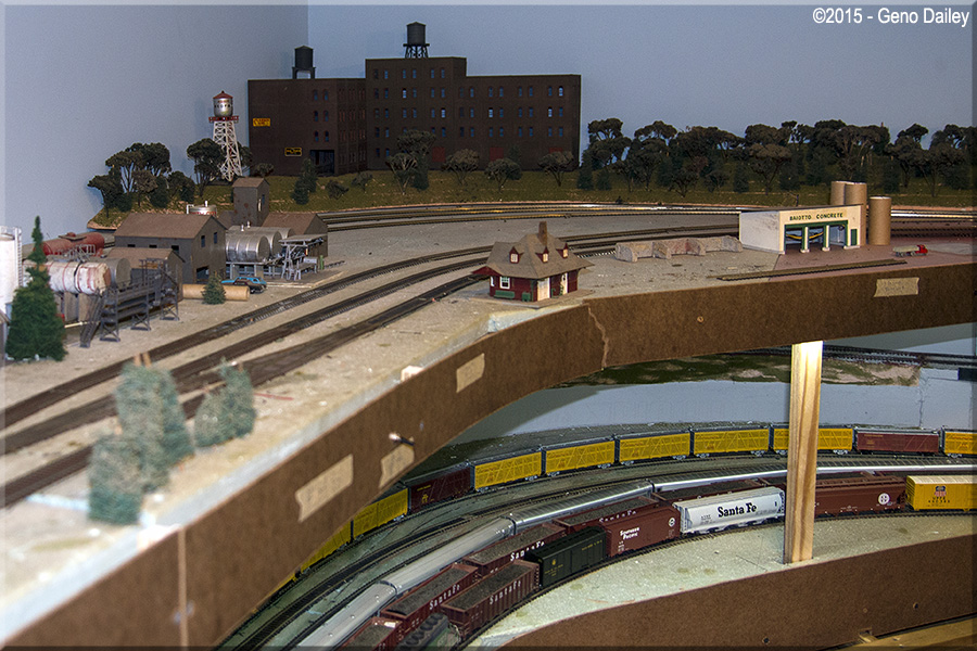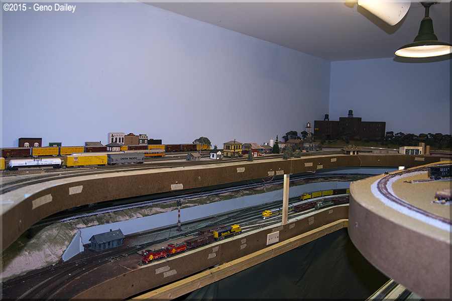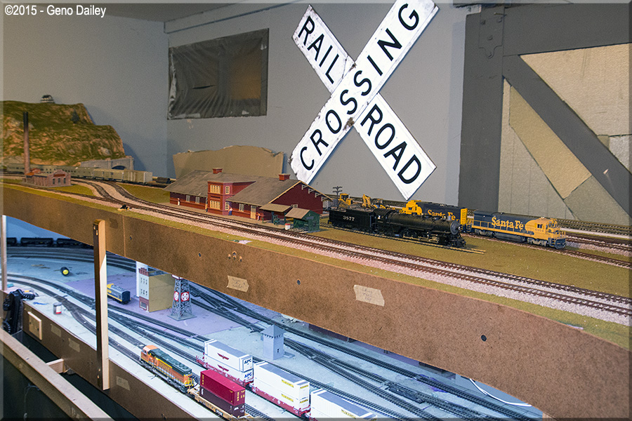 The layout features two levels and models various industries and mostly features Santa Fe trains but other railroads are represented. |