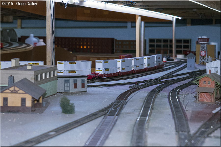 Two different eras of the Santa Fe Railway represented here on the top level and some modern stack train freight action on the lower level. |