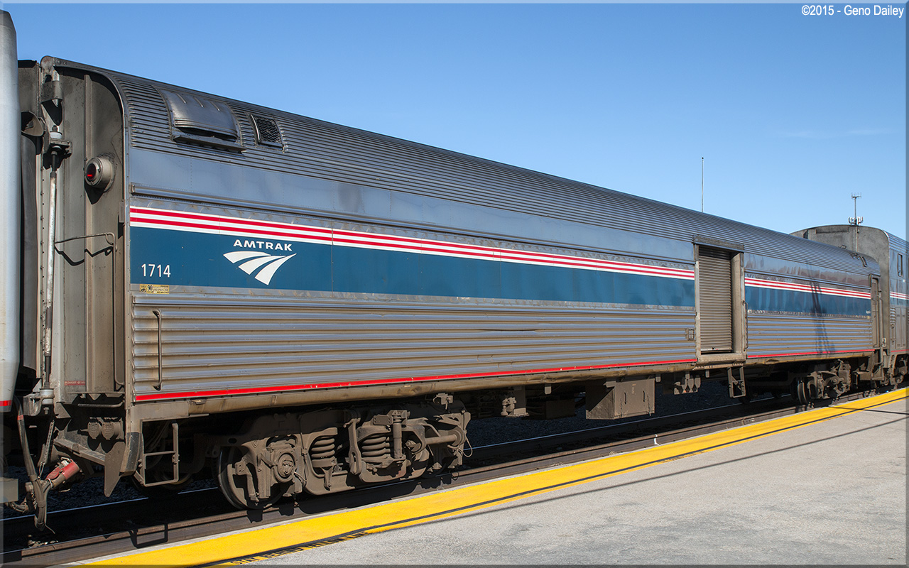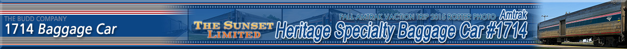 Built by Budd as a 48 seat coach for the Atchison, Topeka & Santa Fe Railway in 1953 and numbered 2850. This car was also equipped with steam-ejector air conditioning under Santa Fe ownership. Conveyed to Amtrak in 1971 and numbered 4862. Converted to Head-End Power from Steam Heat in April 1980 and numbered 4724. Converted to a baggage car in August 1996 and renumbered 1714. Historical information about this car provided by www.amtrakbythenumbers.com. |