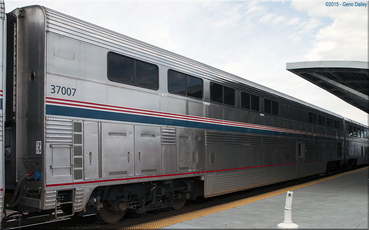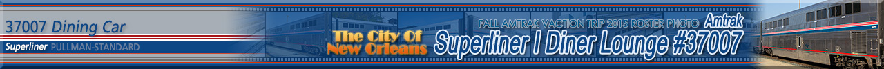 Built in 1980 as a dining car and numbered 38018. Converted to a diner-lounge configuration to allow the car to be used as a dining car and lounge car in the same car. Diner-Lounge conversion was completed in December 2007 and the car renumbered 37007. Historical information about this car provided by www.amtrakbythenumbers.com. |
