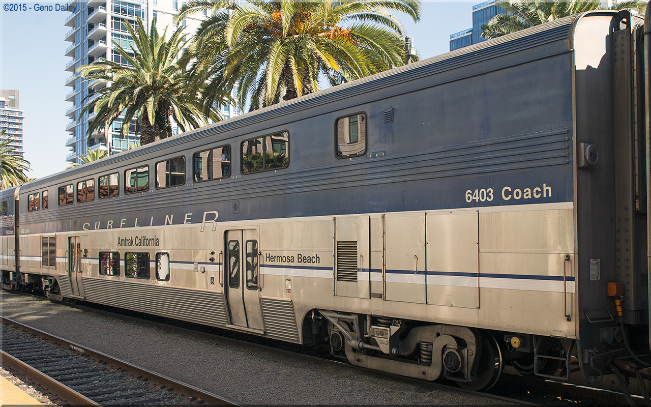 Built in June 2000 as a coach operating on Pacific Surfliner trains between Los Angeles & San Diego along with Surfliner trains operating from Los Angeles north to as far as San Luis Obispo. These cars when first built didn't have names but would begin to have names starting in 2008 as they were cycled through Beech Grove for maintenance with this car later being named "Hermosa Beach". Historical information about this car provided by www.amtrakbythenumbers.com. |