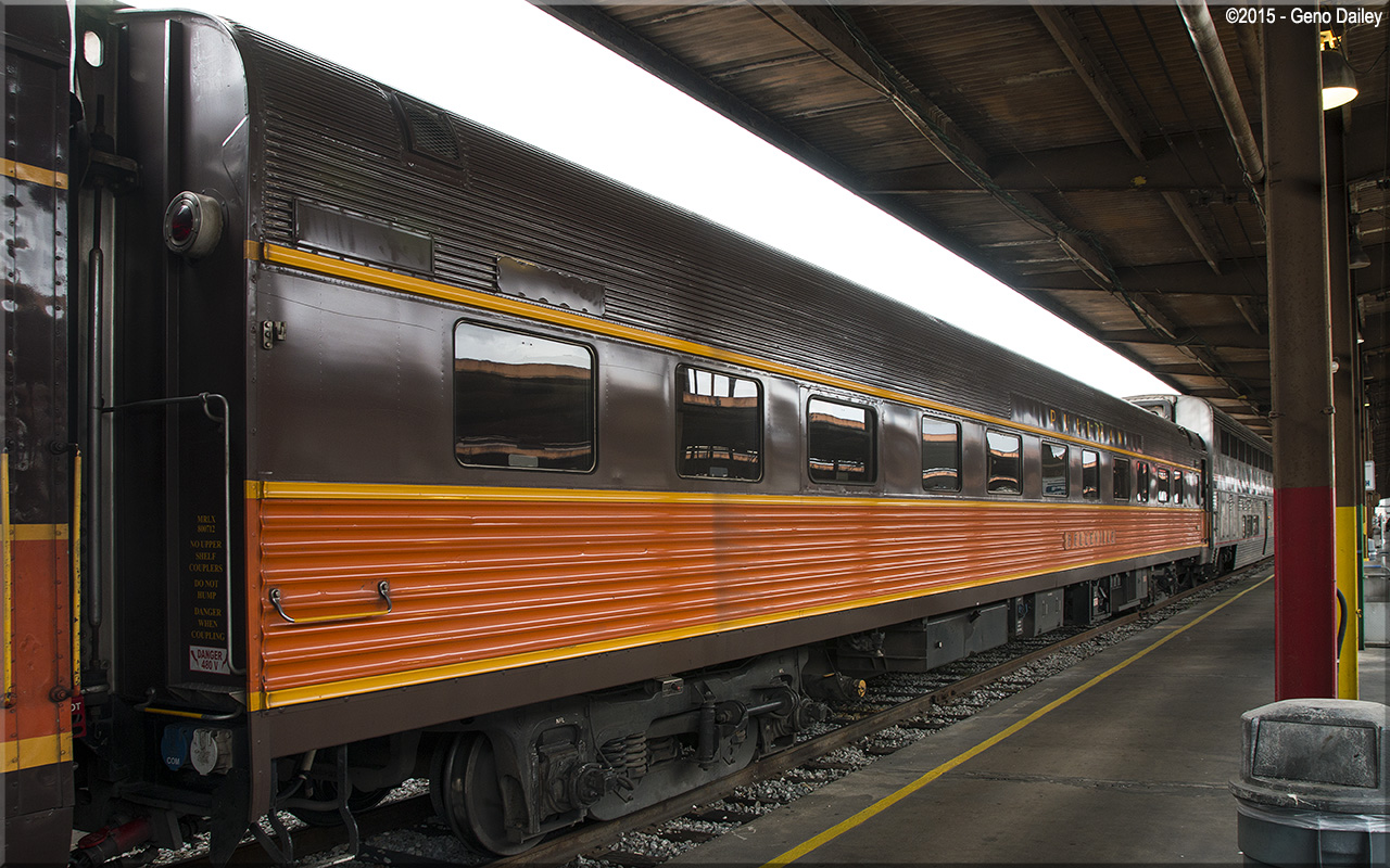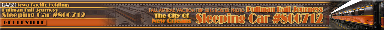 Built by Budd in 1952 for the Chicago, Burlington & Quincy RR as a 5-compartment 6-double bedroom sleeper for use on the CB&Q-Denver & Rio Grande Western-Western Pacific "California Zephyr". Conveyed to Amtrak in 1971 and listed as an 11 double bedroom sleeper and numbered 2201. Converted to Head-End Power from Steam Heat in October 1983 and renumbered 2220. Listed for sale in December 1995 and sold in 1997 to Illinois Transit Assembly Inc. Later acquired by Mid-America Railcar Leasing, followed by Iowa Pacific Holdings who rebranded the car with its Illinois Central-inspired paint scheme and renamed it "Belleville". The car today has Amtrak Private Car #800712. Historical information about this car provided by amtrakbythenumbers.com, & rypn.org. |