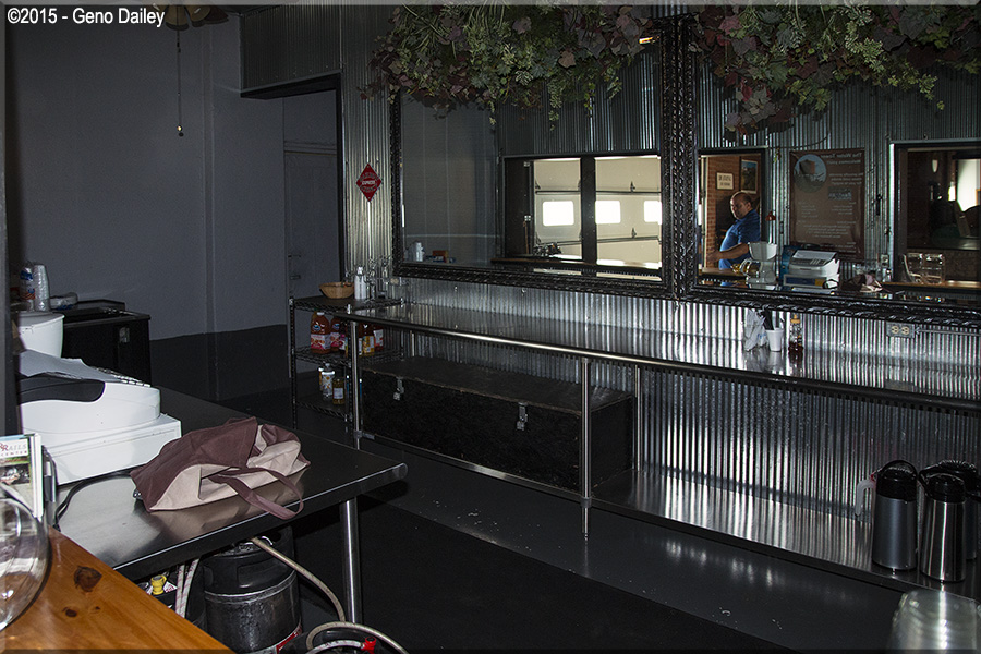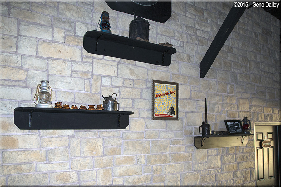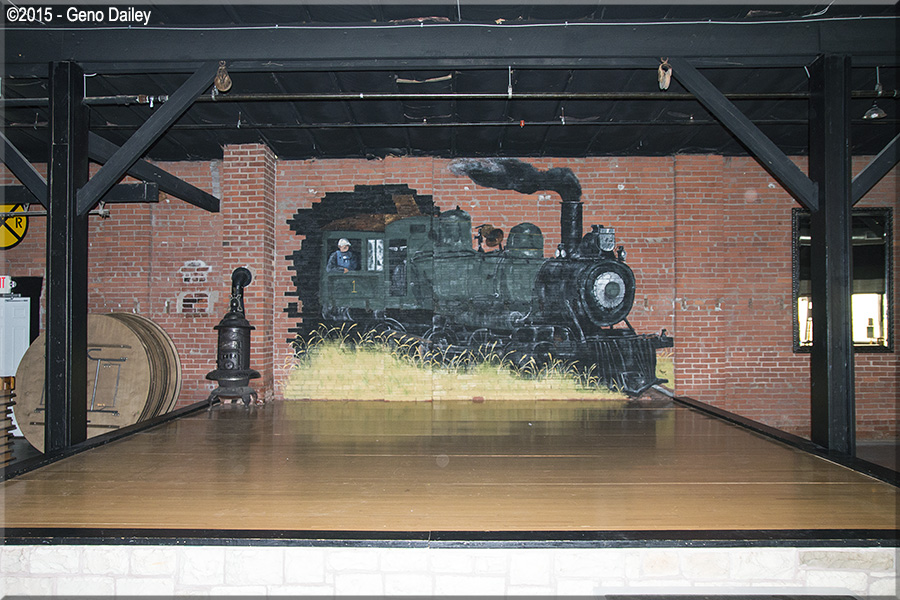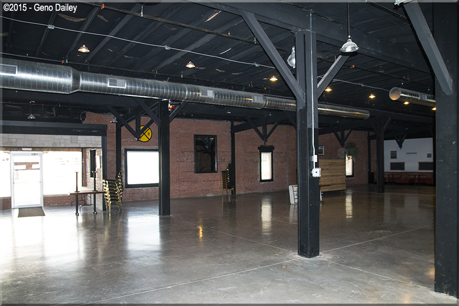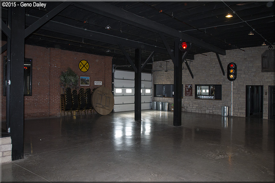 The railroad signal lights and other railroad memorabilia on the walls show off the train theme very well. The hall features a large garage door