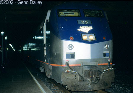 Paul and I rode the RTA Bus back to the Brookpark Station, then picked up the RTA Red Train back to Tower City, then the Waterfront Line Train back to the Amtrak Station. Upon arrival there, one other railfan was waiting for the train to arrive as well, the 3 of us chatted for a few minutes and at 7:12pm, arriving a whopping 18 minutes EARLY, was my train, #43, The Westbound Pennsylvanian. Tonight's train had P42DC's #85 and 96 for power. Shortly after the train stopped, I got out my camera and took the above photo on the platform with some 400 Speed Kodak Ektachrome Slide Film.