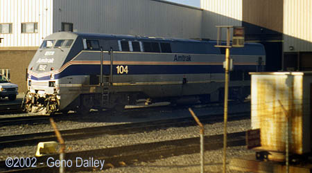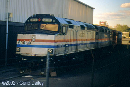 ![]() Amtrak's Rensselaer Maintenance Facility as seen from the window of an Amfleet I Coach. Today, a set of Turboliners as well as a few F40's were parked at the facility as we rode by around 4:30pm. ![]() P42DC #104 was parked at the Rensselaer Shops as we passed by. On the P42's, the Phase 4 Paint Scheme as shown in this photo is becoming rare as these units are receiving the Phase 5 or Acela style blue and silver paint as shown on the locomotive that powered our train seen at the top of this page. ![]() Representing what has become a "by-gone" era in Amtrak is F40PH #319 sitting at the Rensselaer Shops, only a handful of these units are left, once the pride of Amtrak's fleet, they have since been displaced by P40's and P42's on most trains. |