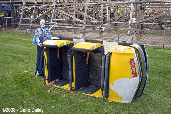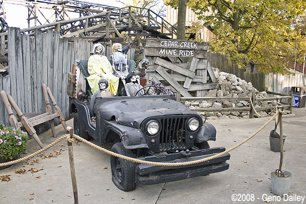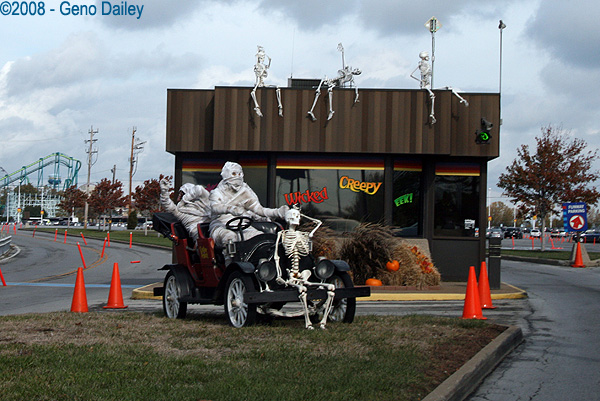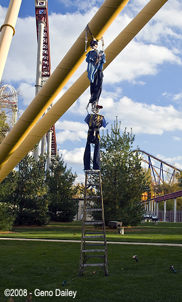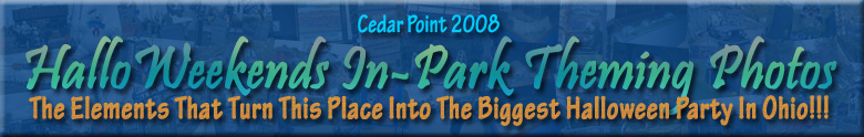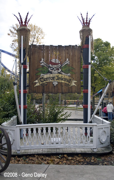 LEFT: Guy Hanging From Dragster: "C'mon just a few more seconds and I'll have it!" - Guy On The Ladder: "Man you've gotta stop eating so many of them hot sandwiches, you're getting fat, my arms can't take it!!!" RIGHT: "Terror Island", new for 2008, you take a trip on the Millennium Force island which is all decked out with screamsters and lots and lots of fog for them to hide in, you won't know which way you're walking!!! |