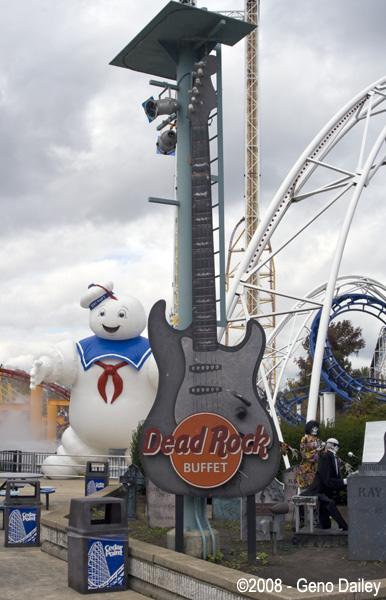 LEFT: The Stay Puft Marshmallow Man!!! Anyone here remember the movie Ghostbusters??? The big confectionary creation made his first appearance at Cedar Point this year during HalloWeekends!!! RIGHT: The Dead Rock Buffet with Ray Charles performing with the big marshmallow "supervising"! |