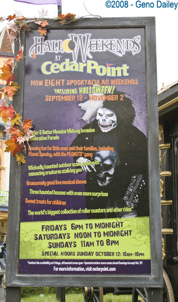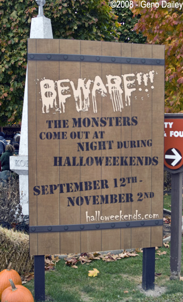 LEFT: You should BEWARE, this park is seriously haunted at night, and it's so awesome when it is!!!! RIGHT: A general info billboard on HalloWeekends. This event just gets better every year, and I should know! For 8 of the last 17 years I've been coming here, it's been during HalloWeekends! |